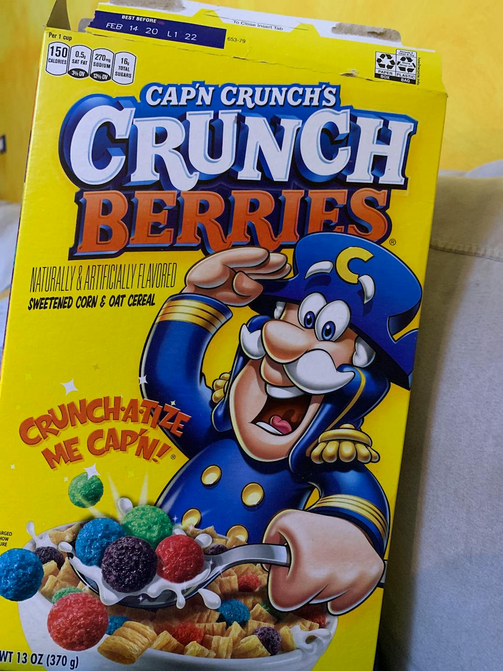 Envase de cartón resistente para alimentos de Cap'n Crunch Berries, cereales de frutas del bosque, en el formato de 370 gramos. Este artículo es ideal, claramente, para comenzar el día de la mejor manera y también con una cierta dosis de diversión. Esto porque en la parte trasera de la caja hay un simpático jueguito (adecuado especialmente para los más pequeños). Pero tened cuidado, Nietos: un desayuno con estos cereales es ideal también para los más grandes porque está lleno de vitaminas y principios activos beneficiosos para el organismo. ¡Cada cereal individual desprende sabor y belleza, porque los colores con los que están hechos recuerdan al arcoíris! ¡Agréguelos al carrito!
