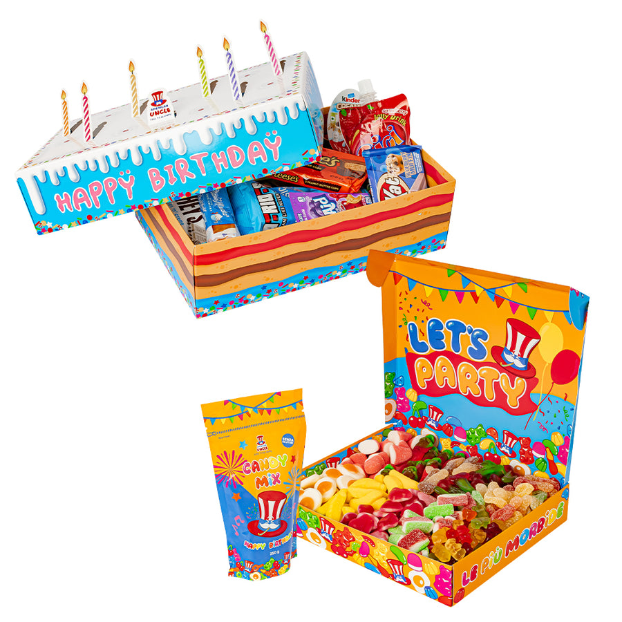 Birthday box e Candy box Birthday Edition. La prima è una scatola a forma di torta di compleanno con le candeline sagomate; contiene 15 snack - sia dolci che salati - provenienti da ogni parte del mondo e un Candy Mix da 250g piena di caramelle gommose. La seconda è una scatola da riempire con 1kg o 1,8kg di caramelle gommose scegliendo 10 gusti diversi tra più di 50 disponibili.