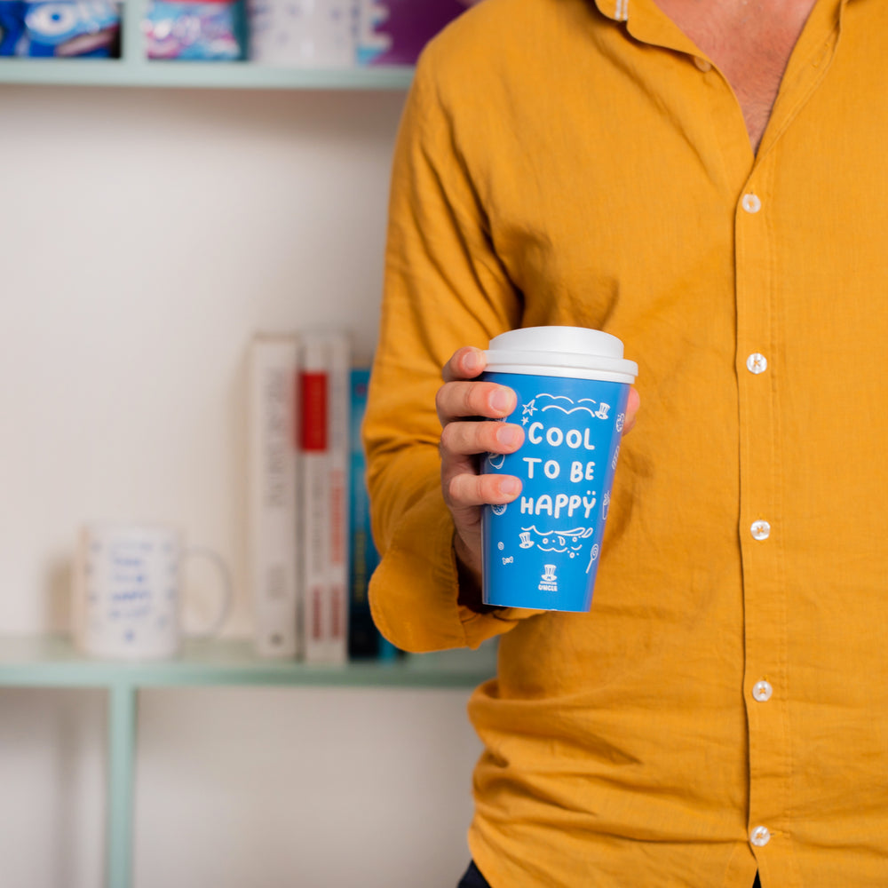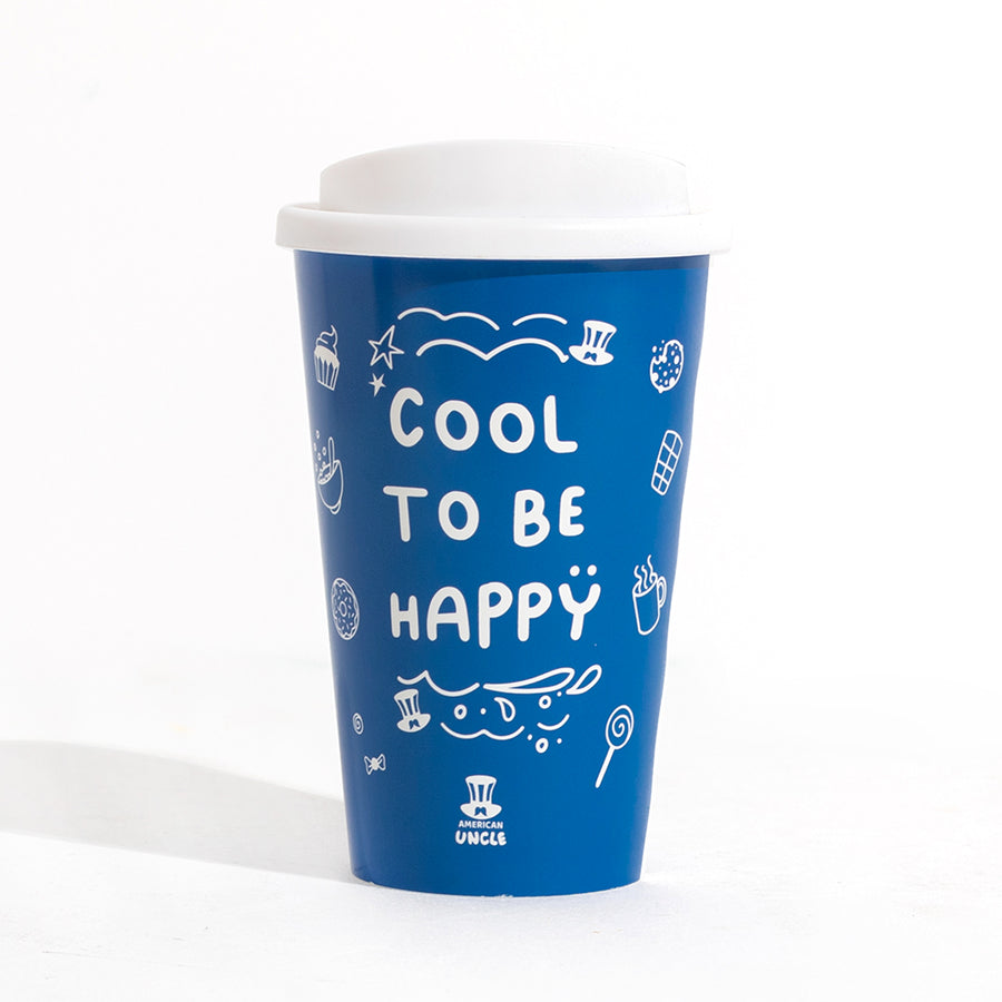 Taza térmica Cool to be Happy de 350ml, vaso térmico resistente de doble pared con tapa de rosca, apto para lavavajillas y microondas, color azul con texto Cool to be Happy blanco, dimensiones 15,5 x 9,5 cm.