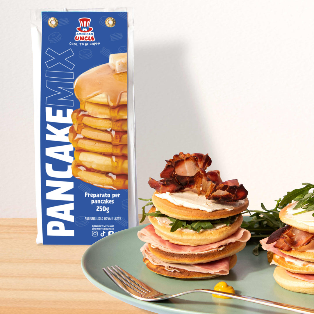 Con la mezcla para tortitas de American Uncle puedes hacer recetas tanto dulces como saladas: añade deliciosos trozos de fruta fresca, unta una de las cremas New Heroes, vierte por encima sirope de arce My Cousin o adórnalas con jamón, queso o crujientes lonchas de beicon.