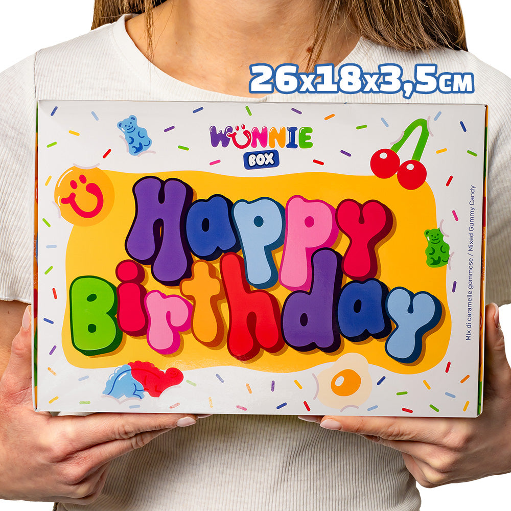 ¿Estás buscando un regalo de cumpleaños que deje huella o quieres una tarta alternativa? Aquí tienes Wunnie box “Happy Birthday”: una caja súper COLORIDA que por fuera parece una tarta, pero por dentro esconde 1 kg de caramelos de goma.